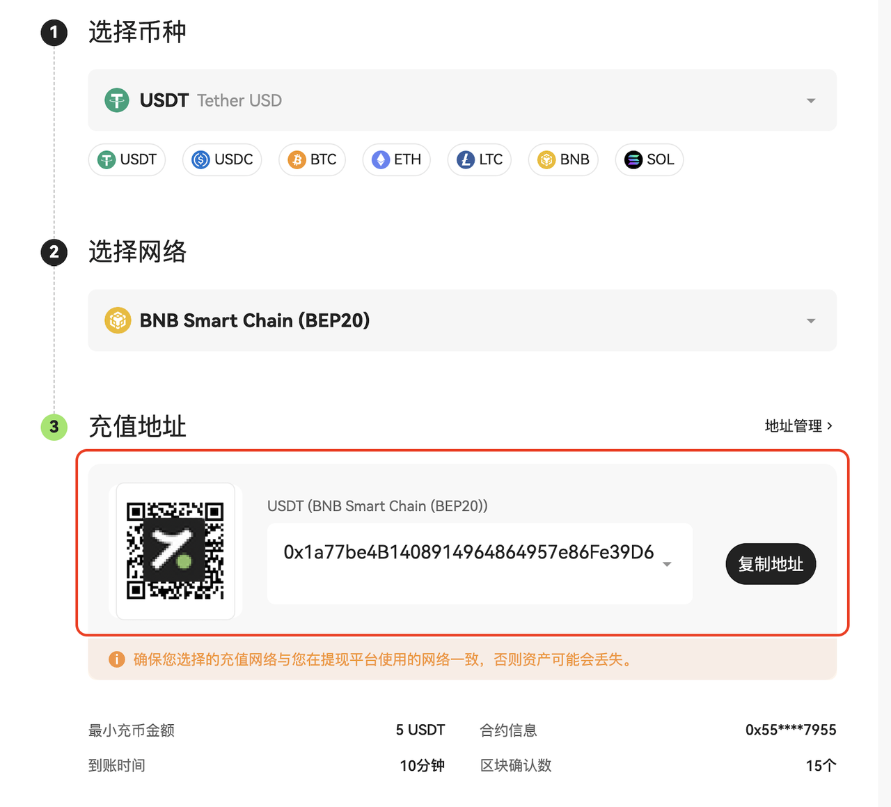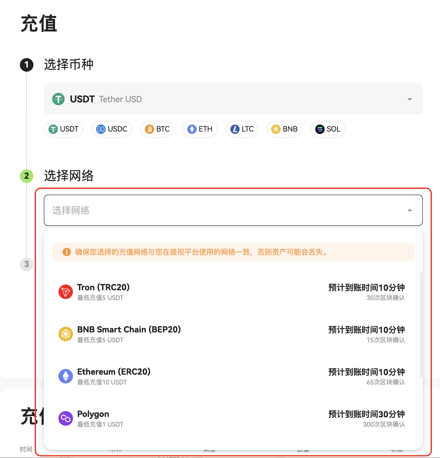 - 请务必确认所选充值网络与提现平台的网络一致,选择错误的网络可能导致资产丢失且无法找回;