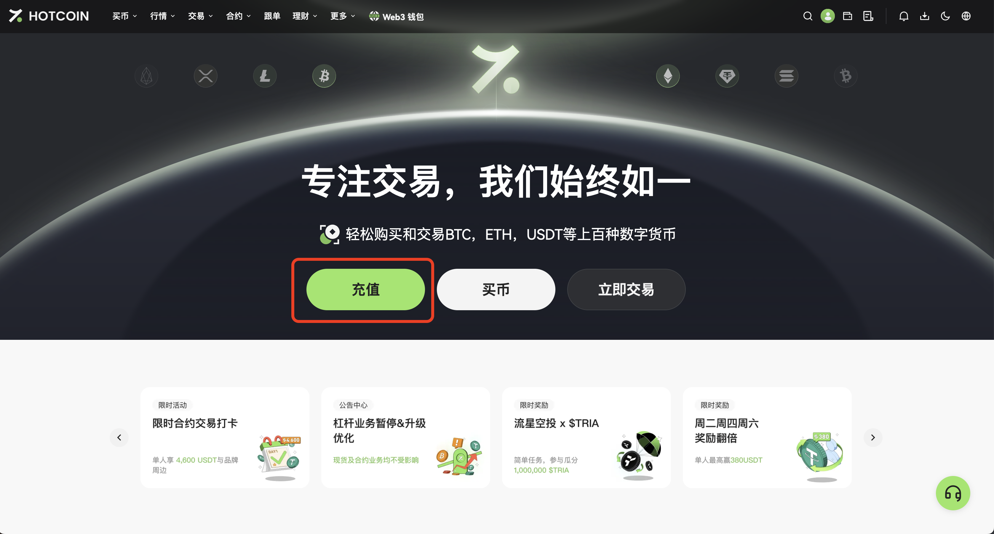 充值是指将数字资产从外部交易所或钱包转入到 Hotcoin 平台账户。本文将说明如何在 Hotcoin 网页端进行数字货币充值,请依照下列步骤操作。