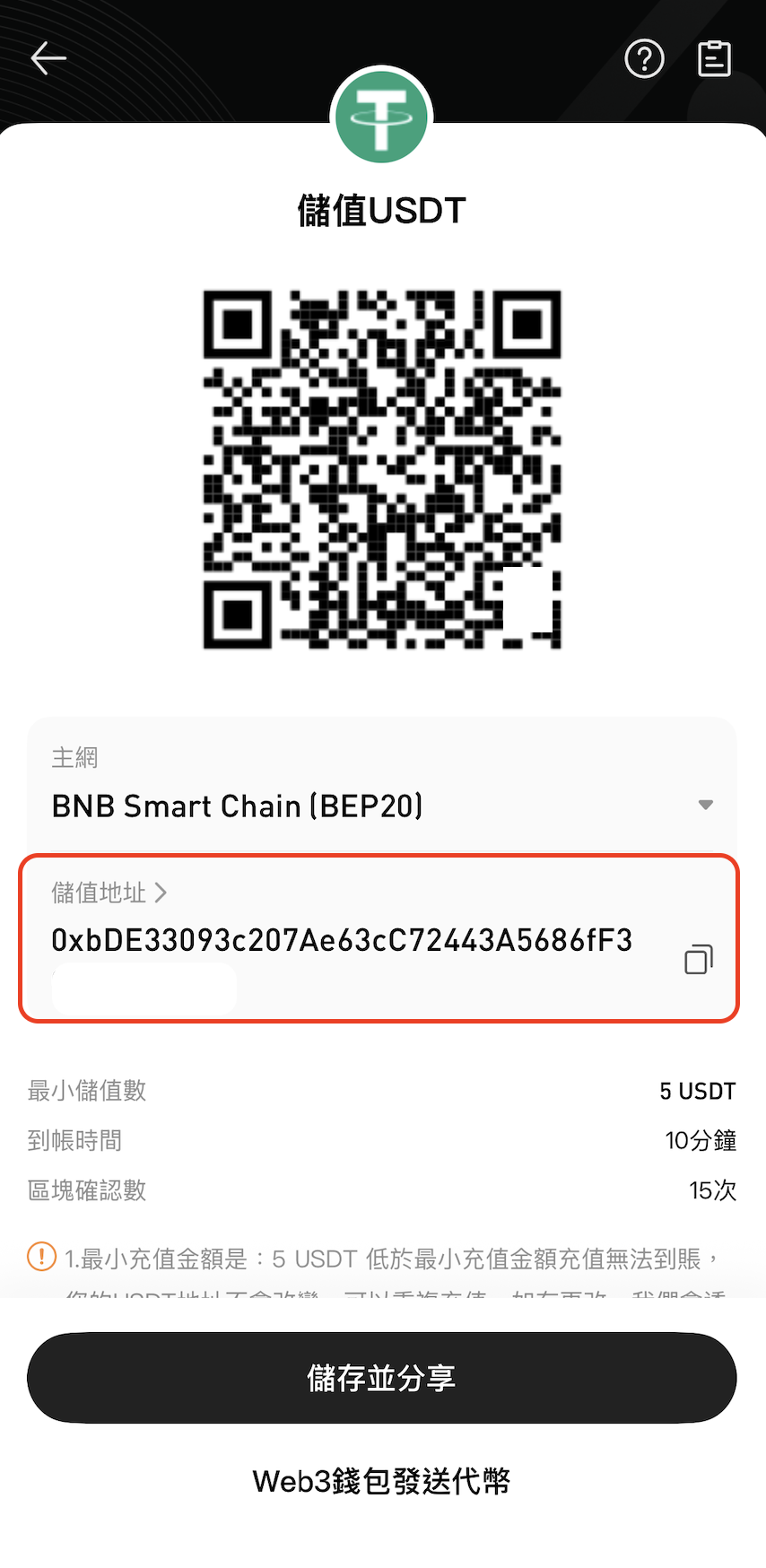 💡 提示:您也可以點擊「儲存並分享」產生儲值二維碼,透過交易平台 App 或錢包 App 掃碼完成儲值。