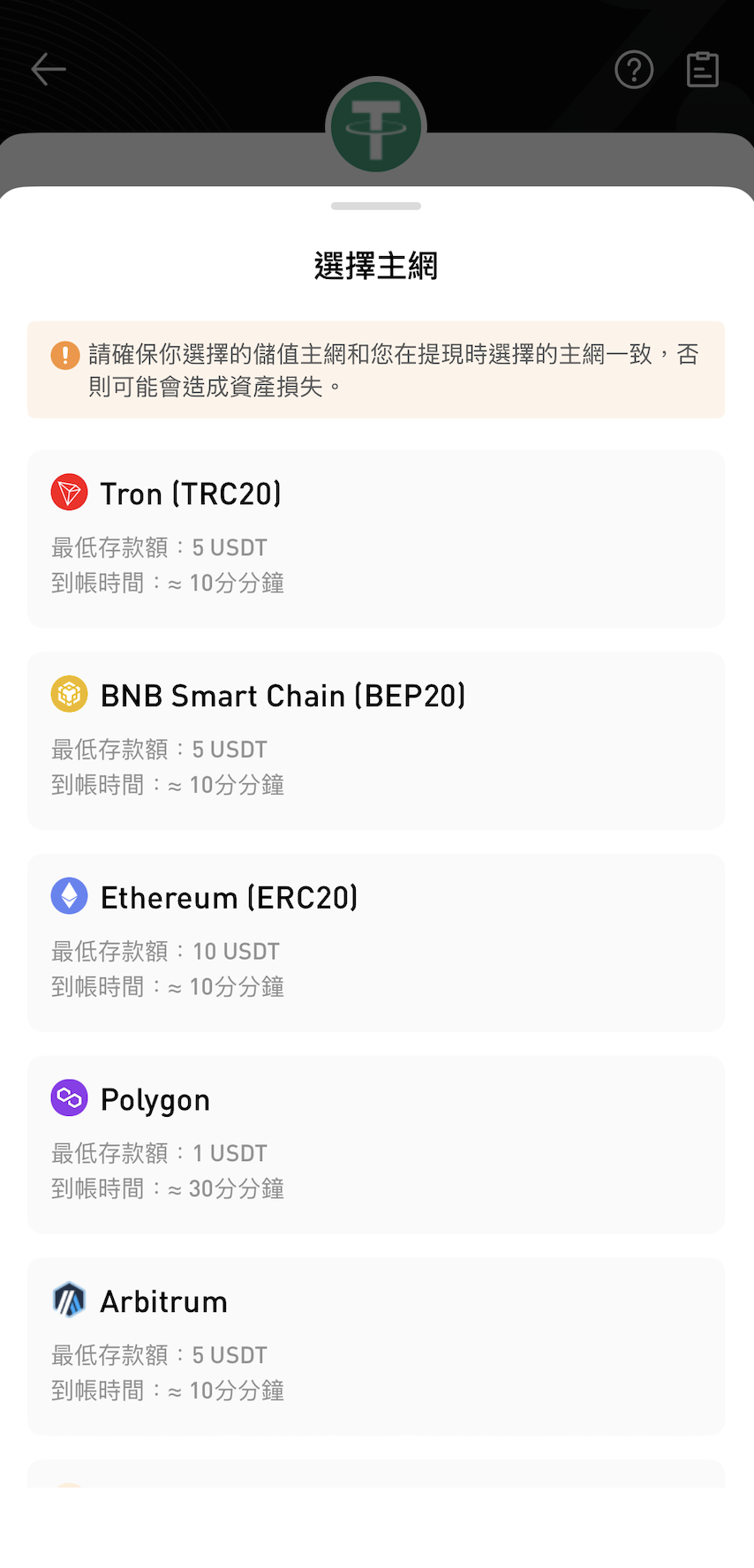 - 請務必確認所選儲值網路與提現平台所使用的網路一致,選擇錯誤的網路可能導致資產遺失且無法找回;