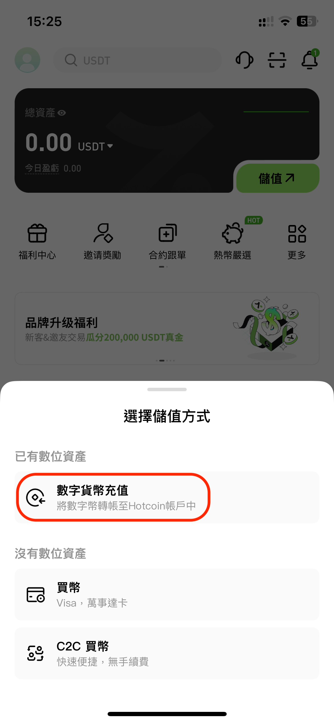 1. 打開 Hotcoin App,於首頁點擊「儲值」按鈕;