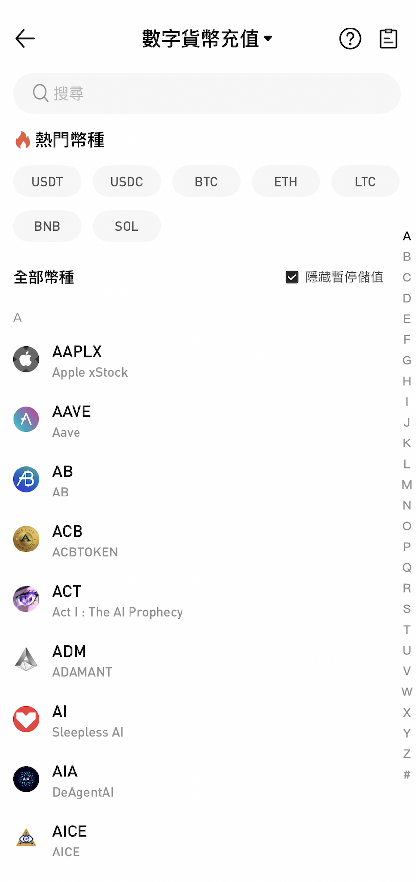 3. 在數位貨幣儲值頁面中,選擇需要儲值的幣種;
