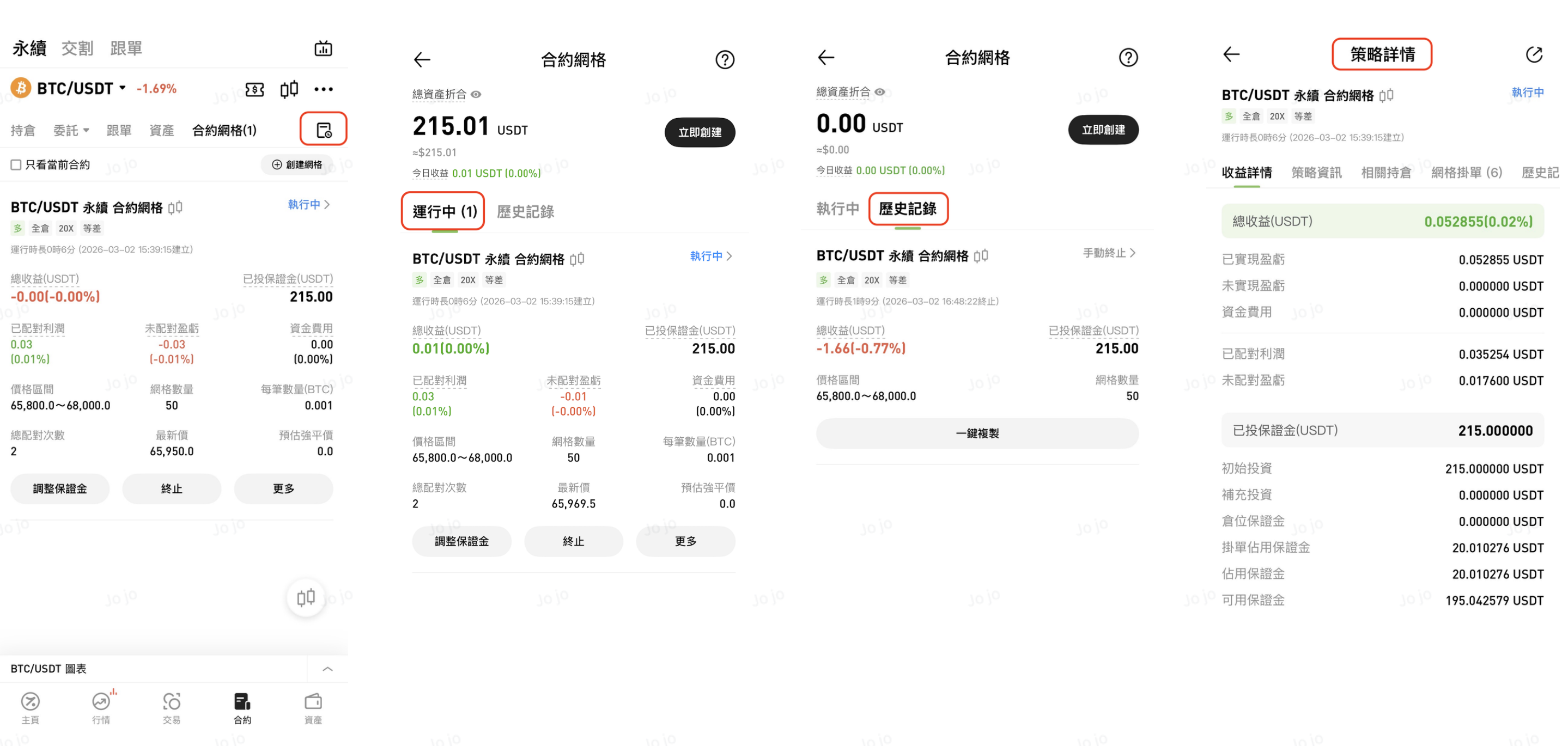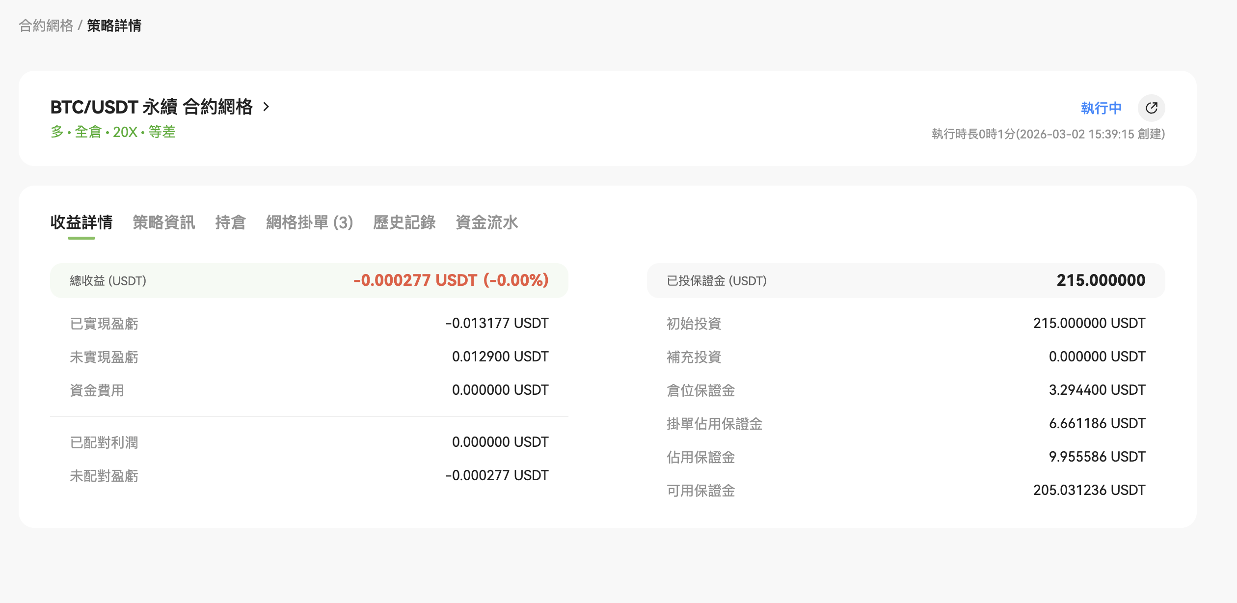 同時,您亦可於合約網格頁面查看目前所有網格策略的總資產情況。