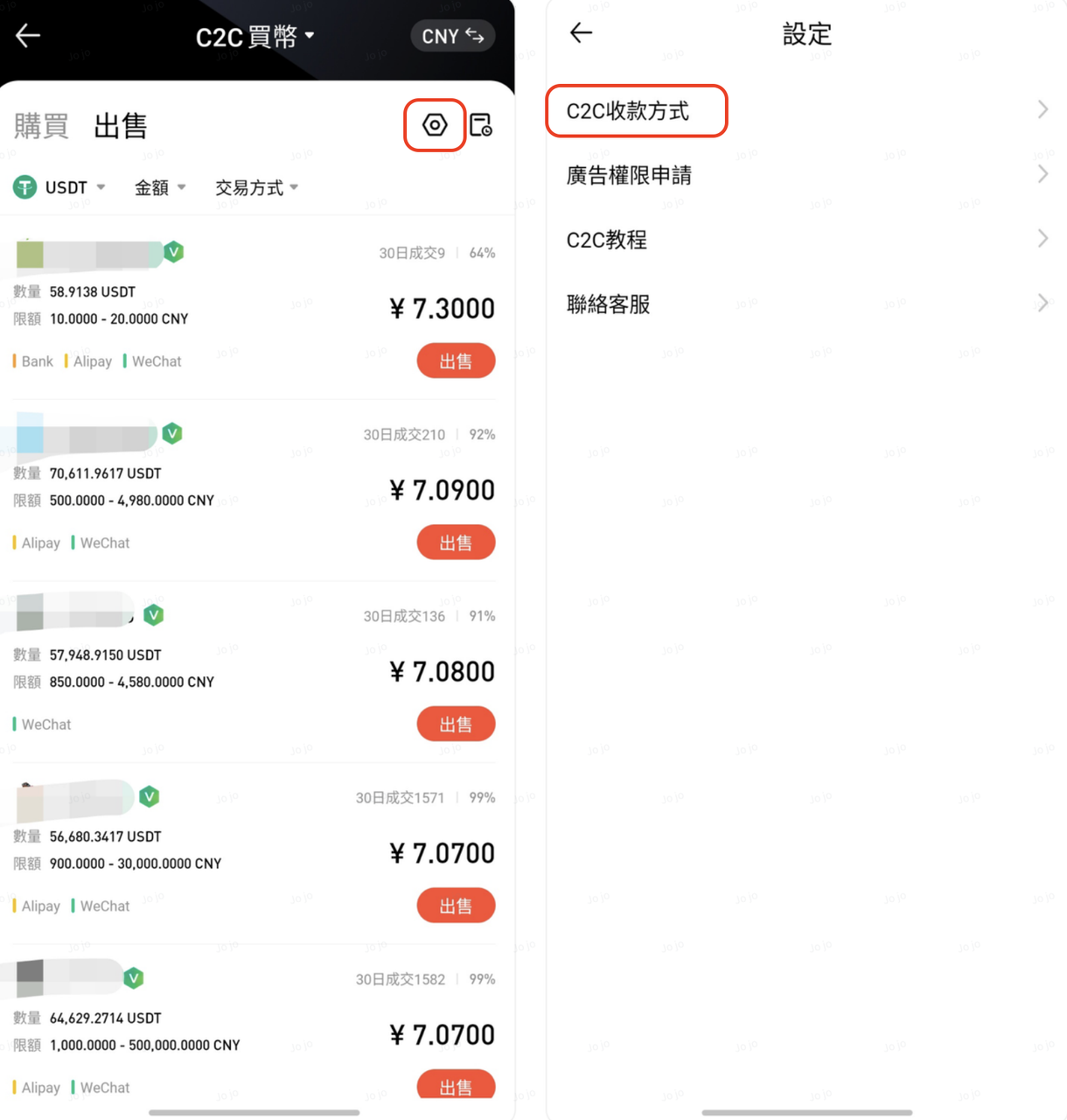 您也可點擊右上角設定圖示 →「C2C 收款方式」,進入頁面新增新的收款方式。
