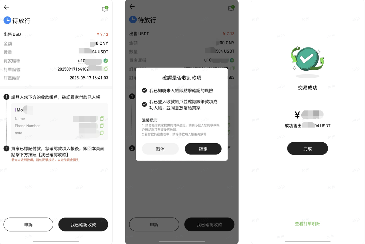 在未確認資金到帳之前,請勿點擊「我已確認收款」按鈕