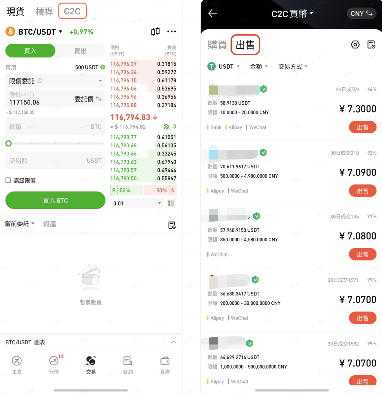 注意:若您的 C2C 帳戶暫無資產,可透過「轉入」功能,將現貨帳戶或其他帳戶中的資金劃轉至 C2C 帳戶。