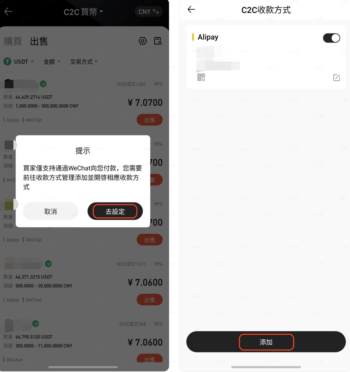 點擊買家右側的紅色「出售」按鈕,在提示彈窗中點擊「去設定」,跳轉至 C2C 收款方式頁面點擊「添加」