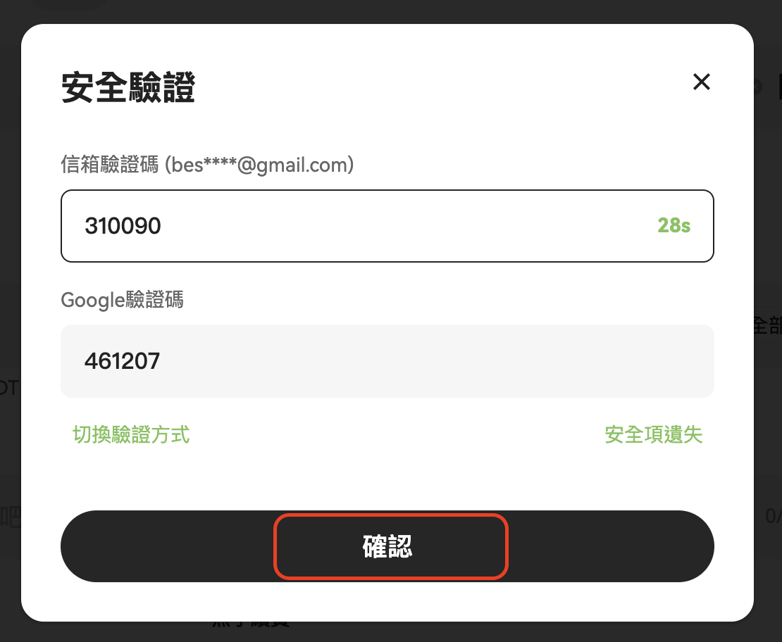 6. 依提示完成安全驗證(如簡訊、電子郵件或 Google 驗證),點擊「確認」;