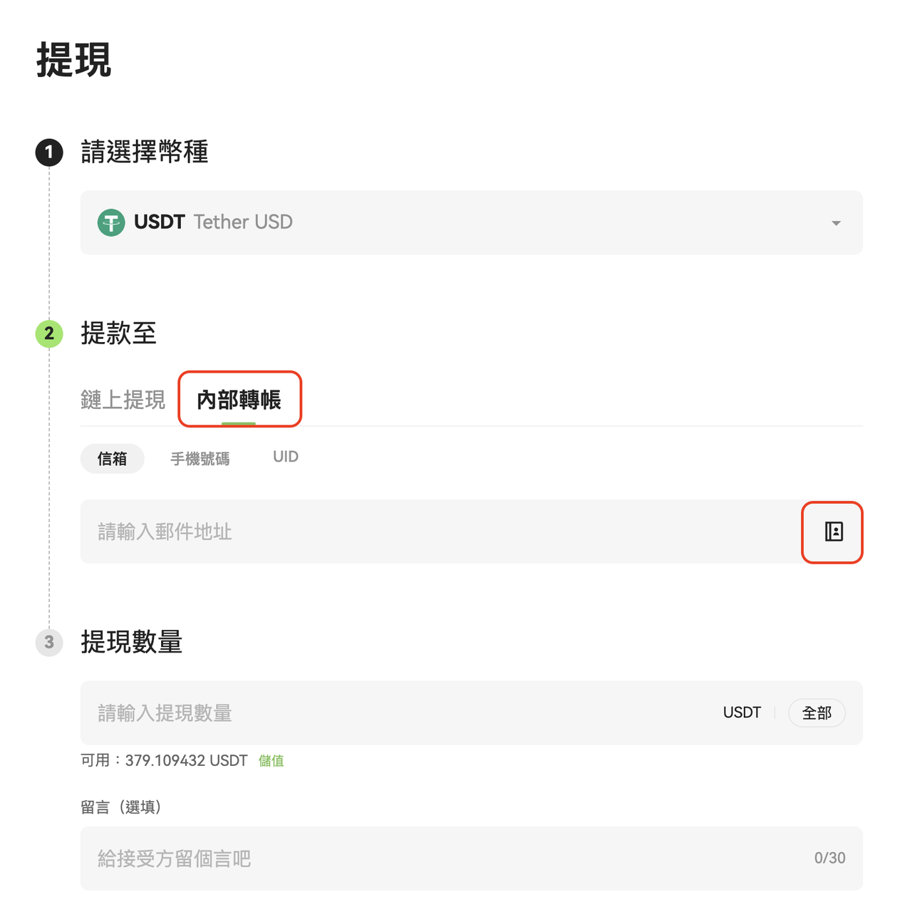 3. 點擊「內部轉帳」,並選擇「轉帳方式」(電子郵件 / 手機號碼 / UID);如需新增或管理收款人資訊,可點擊收款帳號輸入框右側的「地址簿」圖示,並依彈窗提示完成操作;