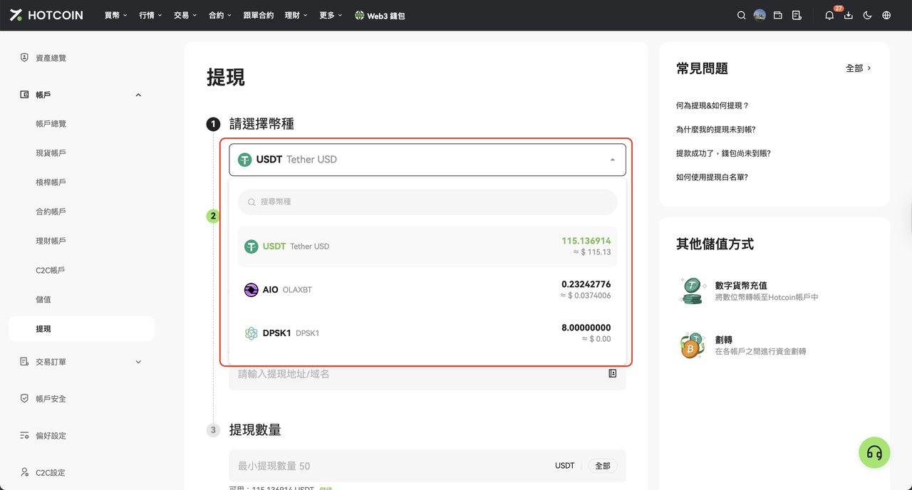 2. 在「提現」頁面中,於「請選擇幣種」下拉清單選擇要轉帳的幣種(如 USDT);