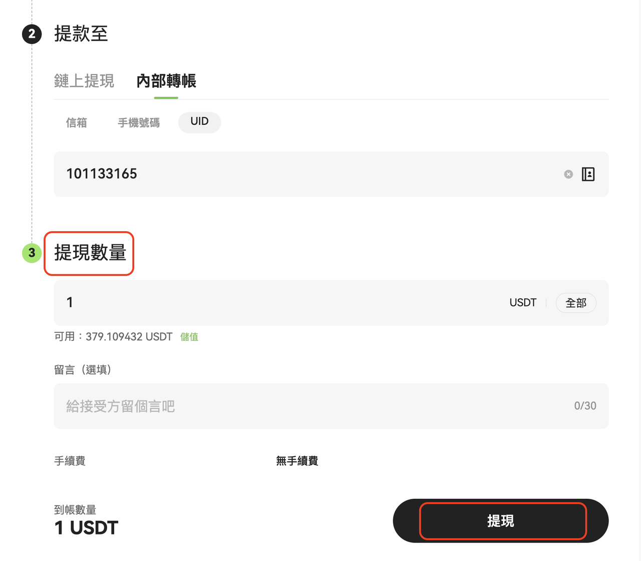 4. 在「提現數量」欄輸入轉帳金額,點擊「提現」;