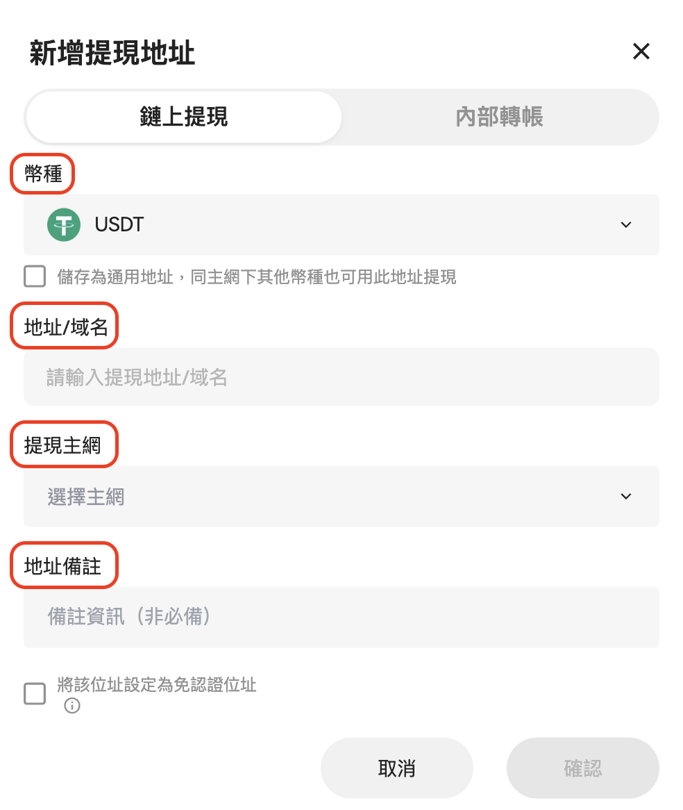 4. 在「新增提現地址」彈窗中填寫以下資訊: