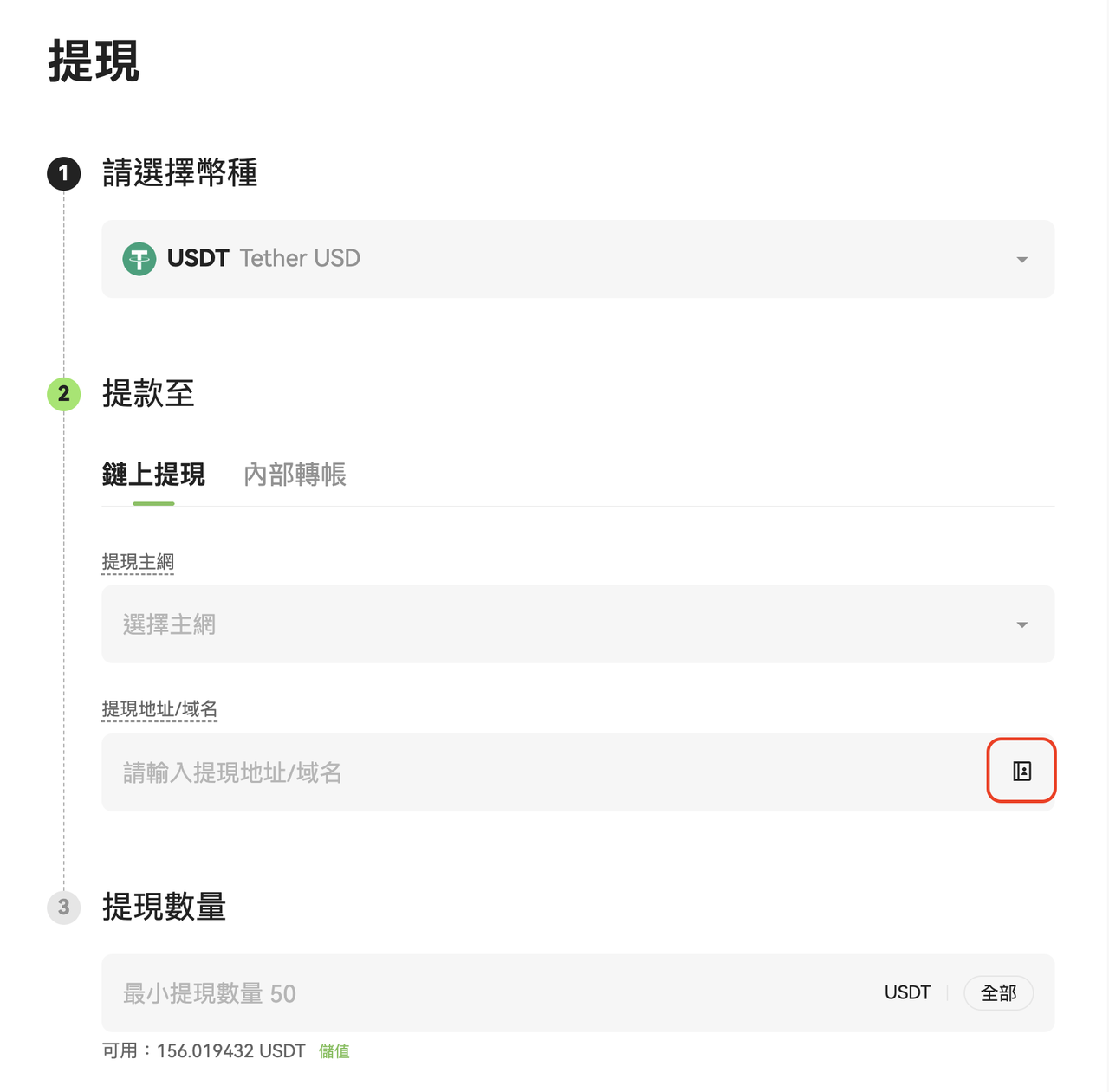 2. 在「提現」頁面,點擊地址輸入框右側的「地址簿」圖示;