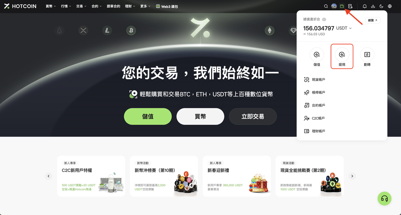 1. 登入 Hotcoin 官網,進入「資產」→「提現」;