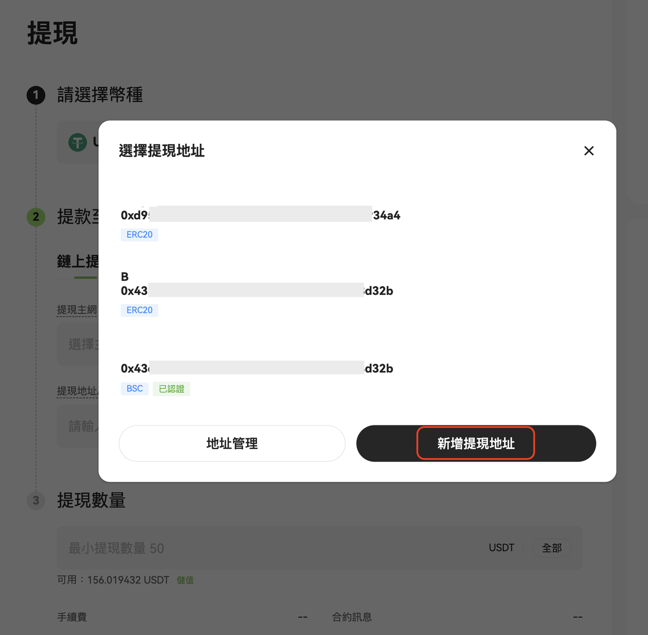 3. 在「選擇提現地址」彈窗中,點擊「新增提現地址」;